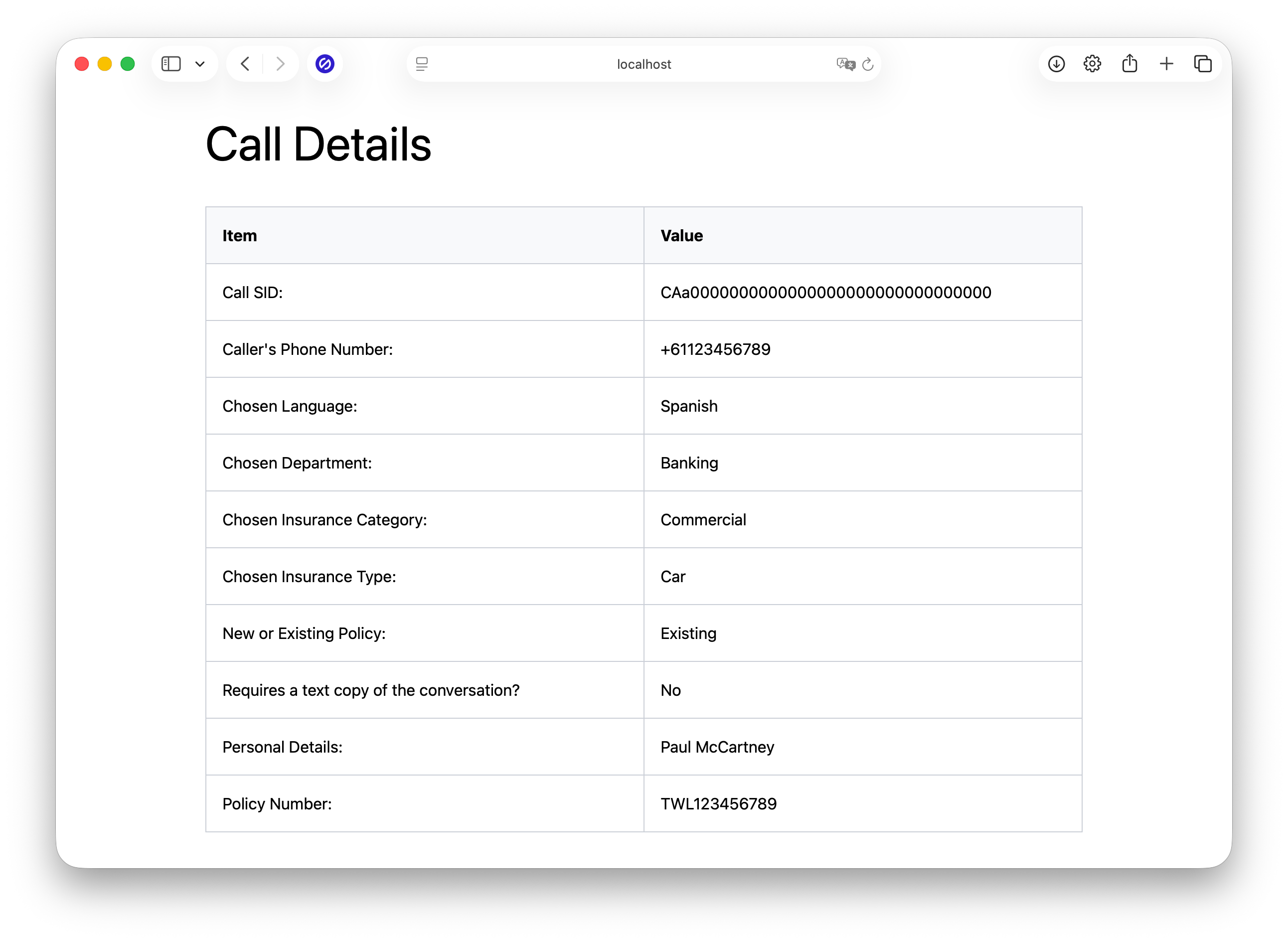 Regardless of the input that you give, when the call ends, in your browser of choice open "http://localhost:8080/caller-input/{callSid}". You'll see the agent dashboard with the caller’s input displayed. It should look similar to the screenshot below.