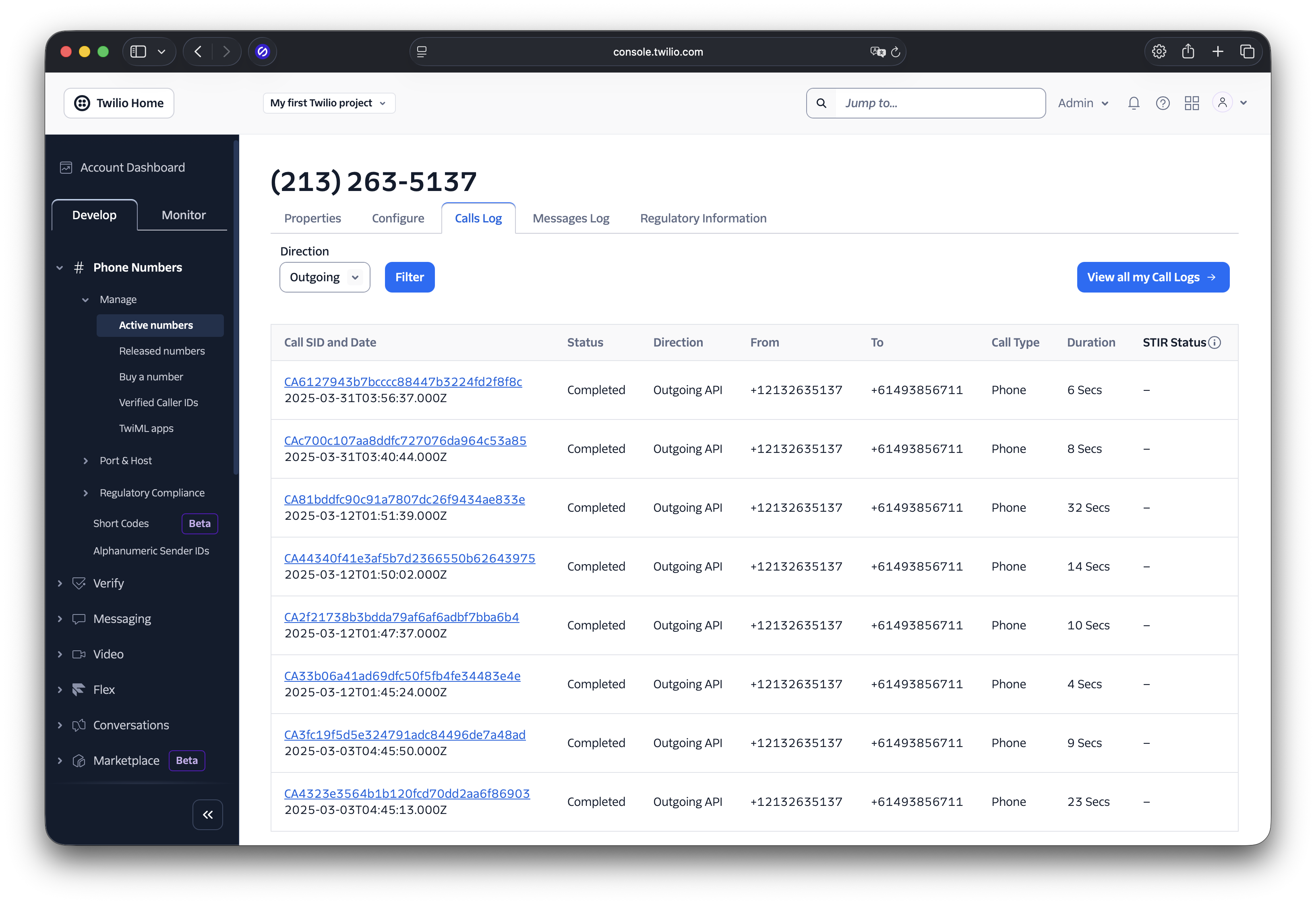 It can be retrieved from the Twilio Console, as you can see in the screenshot above. But, to have the reader retrieve the call SID from there would take a bit of instruction to guide the reader through how to do so. This instruction would need to include searching for the Call SID, if the user had been experimenting with the application for some time, resulting in a large list of Call SIDs.