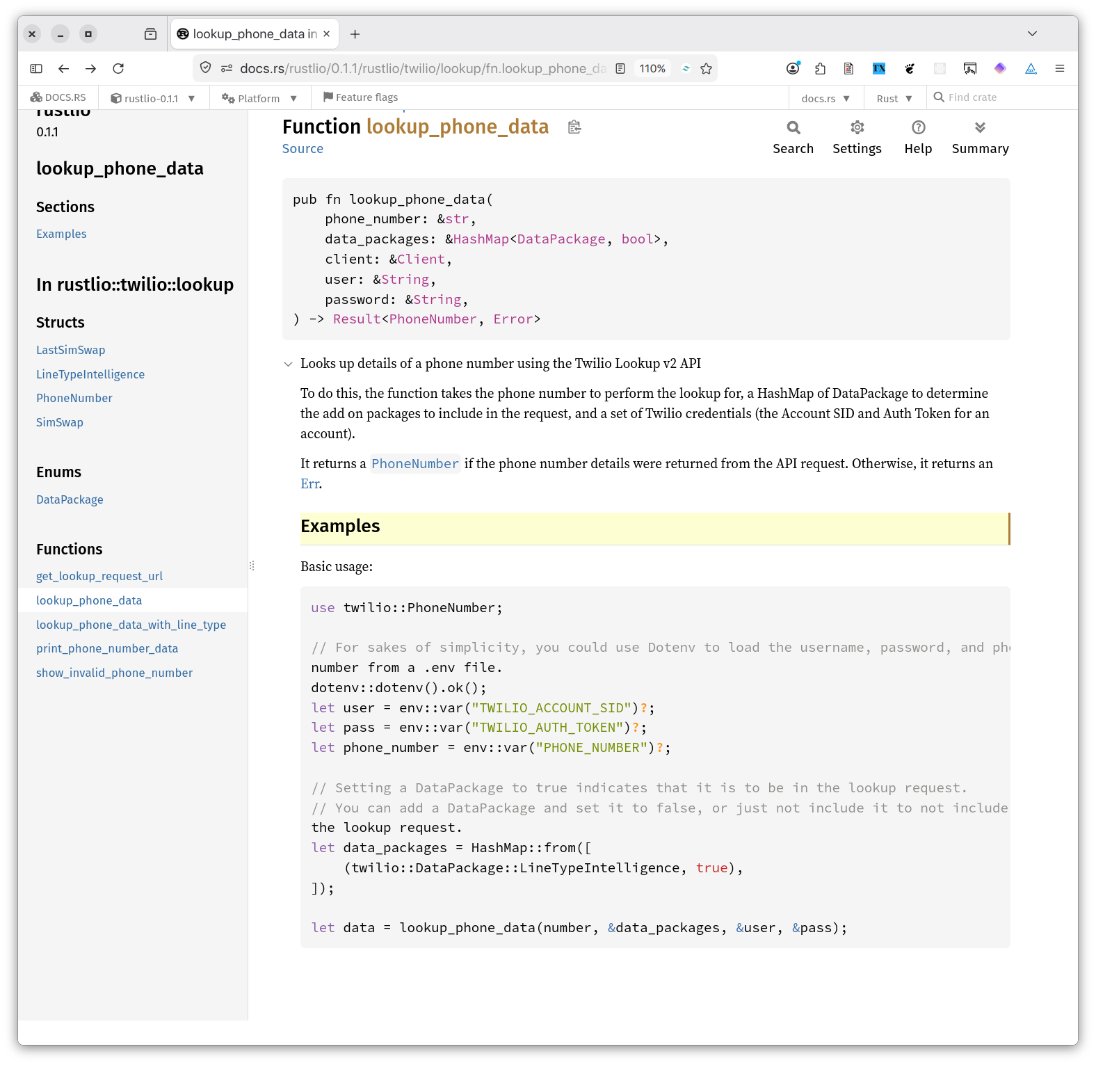 In the code block above, you can see the lookup_phone_data function. Without diving too deep into its workings, it retrieves details of a phone number using the Twilio Lookup v2 API with a blocking Reqwest Client object. To do this, the function requires the phone number to retrieve, an HTTP client for making API requests (it's early days for the library), and a set of Twilio credentials to make authenticated requests to the API.