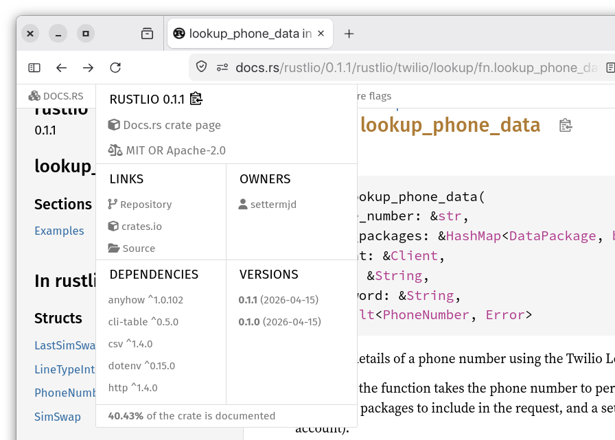 This went on for some time, resulting in mixed progress, until I made a commitment to myself, recently, to just keep going no matter how challenging I found it. To help out with staying consistent this time, I decided to start bringing together code from a number of the Rust tutorials that I've written for the Twilio blog into my first crate, making sure that it had solid documentation.